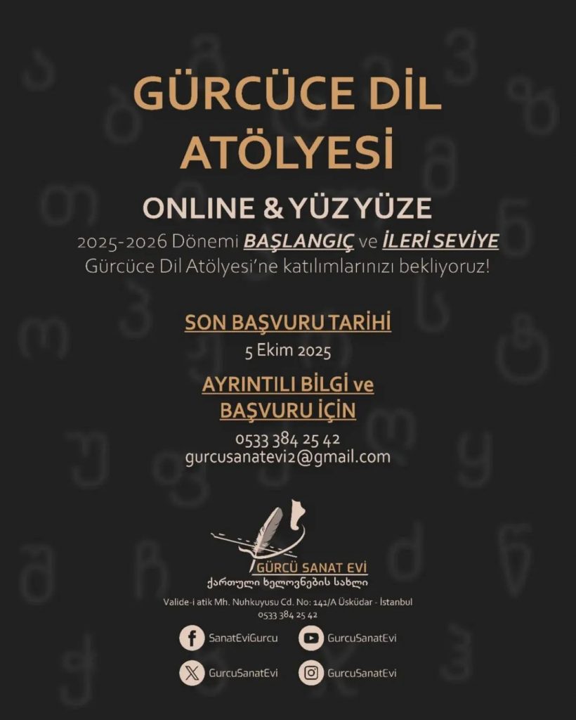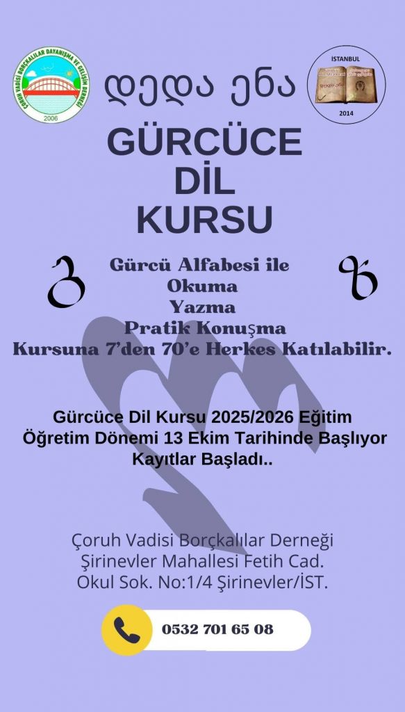 Bu arada tavrımız İstanbul özelinde დედა ენა / Gürcüce anadili kursu talep eden takipcilerimize Avrupa Yakası için Borçkalılar derneği (+90 532 701 65 08 ), Anadolu yakası için Gürcü Sanat Evi’nde devam eden kurslara yönlendirmeye yapmaya devam devam ediyoruz.