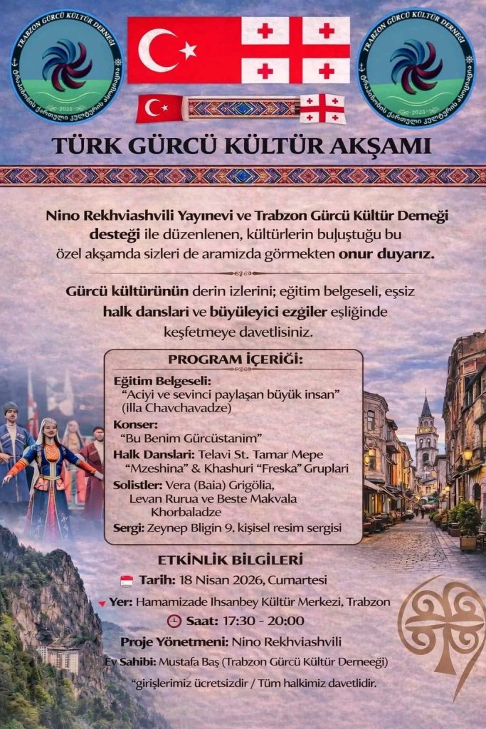 TRabzon Gürcü Kültür Derneği olarak, Gürcü Dili ve kültürü Koruma Haftası kapsamında 18 Nisan tarihindeki Etkinliğimize Gürcistan Tiflis’ten ünlü yazar ve akademisyen Nino Rekhviashvili öncülüğünde, 75 kişilik dev bir kadro eşliğinde düzenlenecektir.